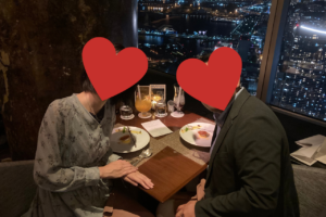 私にとって初めてのことばかりで戸惑うこともたくさんありましたが、一生に一度のことなので、思い出に残るイベントにしたいと思い、横浜みなとみらいのチャペルを貸し切ってプロポーズし、そのあと横浜ランドマークタワー70Fのレストランで一緒に食事をしました。写真はそのときの1枚です。